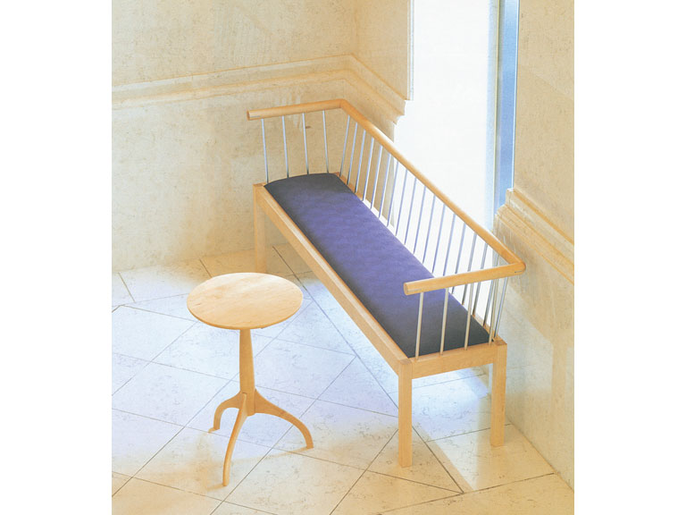 シェーカー家具のシンプルさを現代に翻案したベンチで、木のスポークの代わりにアルミのパイプを利用、一人がけを含む多様な展開が可能。同じコンセプトに基づく座椅子もある。