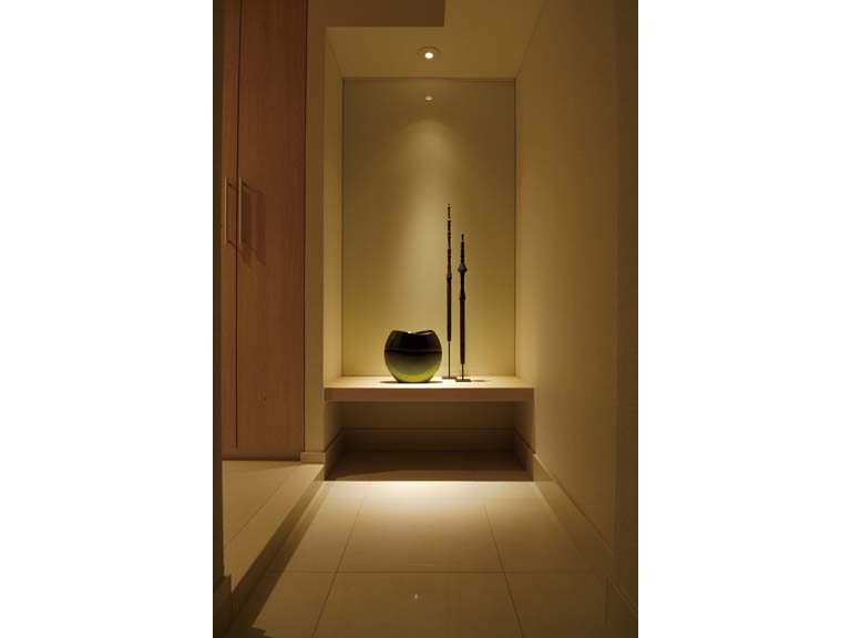 都心に近いのに東京の外れにあるような印象を払拭することを目的としたコンパクトなマンションのモデルルームで、生活感をいかにお洒落に演出するか工夫したのが特徴である。狭いリビングとキッチンを隔てるキャビネットはキッチンのバックカウンターとしての十全な機能とリビング側からの大型テレビ収納がスマートに両立するように、またベッドのヘッドボードには小物収納がエスプリに富んだデザインで実現されている。